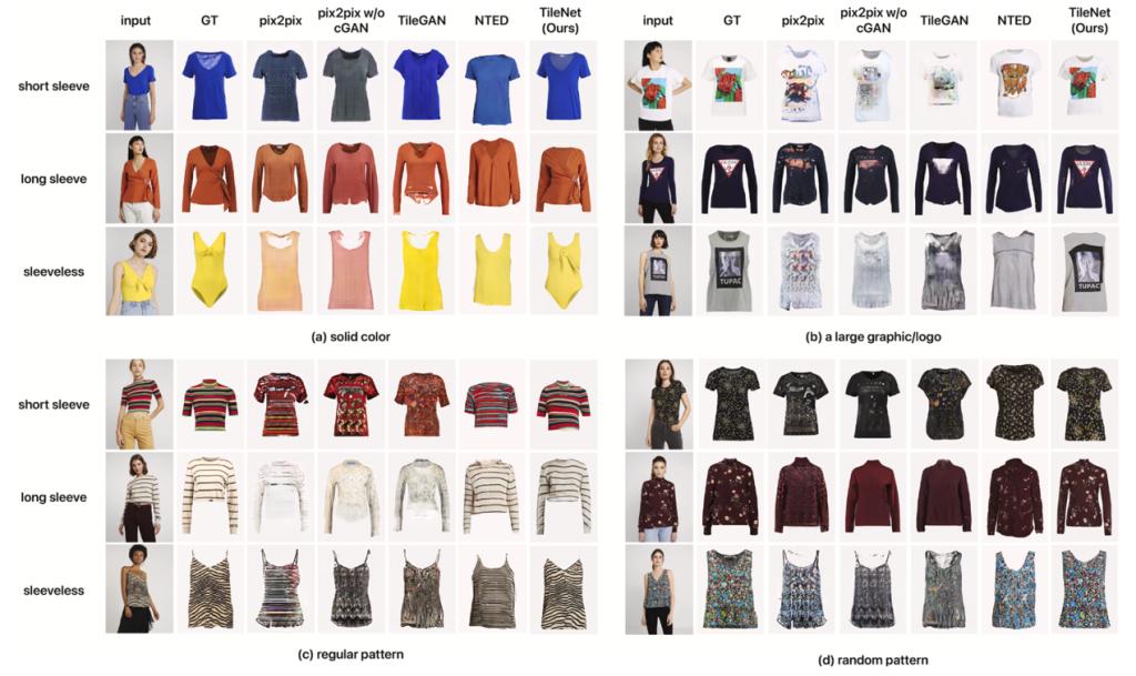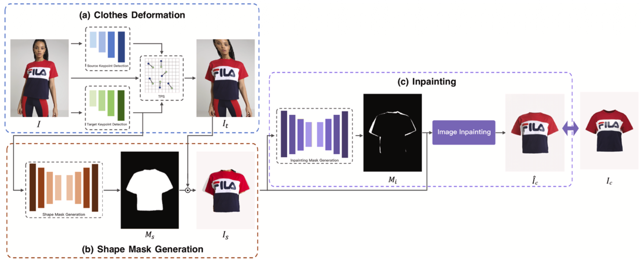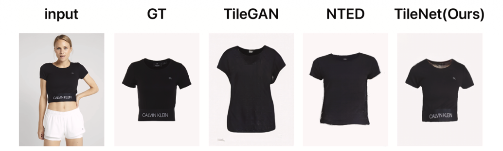 该模型包含三个模块:服装形变模块:将人体上的衣物通过薄板样条(Thin-Plate Spline, TPS)变换到接近平铺的状态;形状掩码生成模块:去除大部分无关信息并约束服装的整体形状;图像修复模块:识别可直接保留的区域与空缺区域,对空缺部分进行填充。通过上述处理,模型能够生成在视觉上更加平整、居中且纹理保真的服装图像。实验结果(包括定性与定量评估)表明,TileNet 生成的图像质量显著优于以往方法,在纹理保留方面尤其突出。