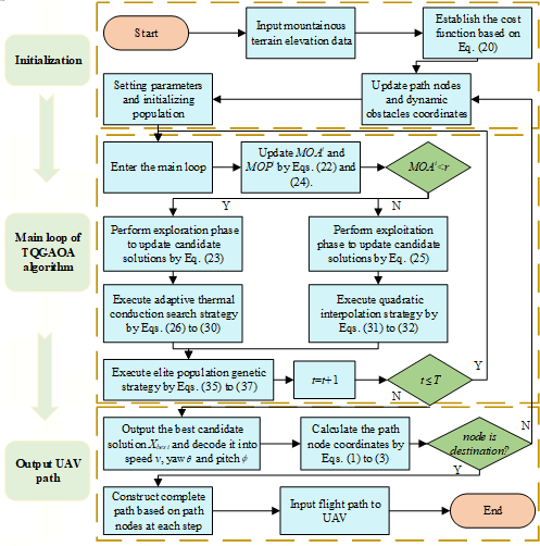 针对山地动态环境下无人机路径规划难题,研究团队以算术优化算法(AOA)为基础,融合多学科技术思路,提出 TQGAOA 算法,通过三大核心策略实现性能跃升: