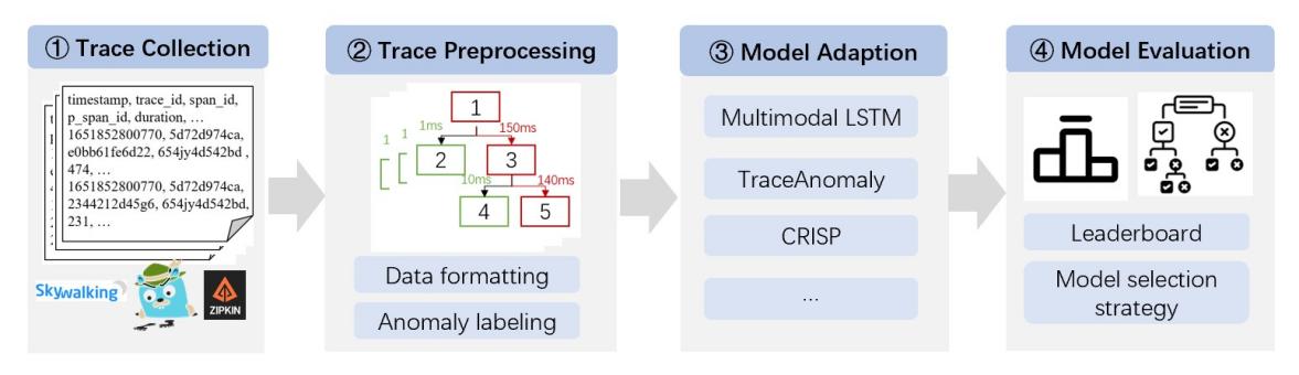TADBench的设计包括四个主要阶段:调用链数据收集、数据预处理、模型适配和模型评估。
