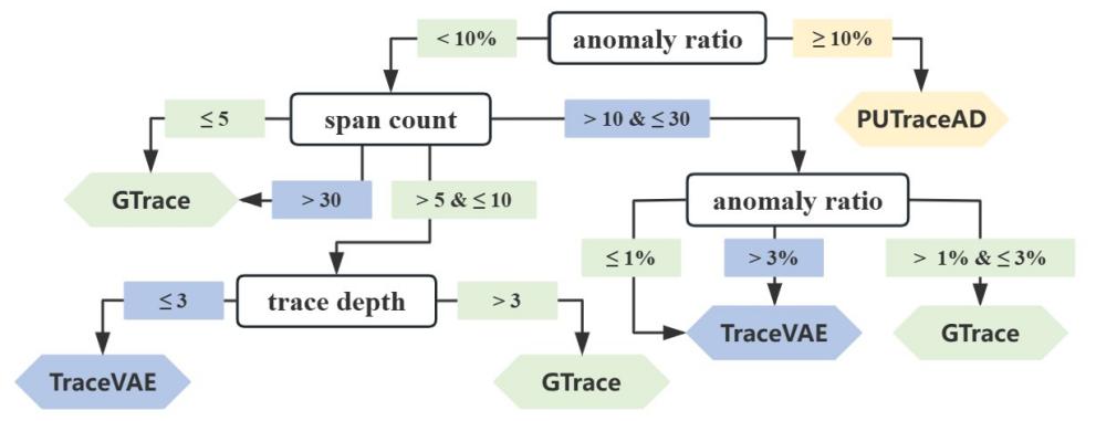 鉴于不同特征的数据集,最优算法的选择也不同,本研究基于决策树提出了一套算法推荐。例如,对于高异常比例的数据集,推荐使用PUTraceAD;对于包含大量span的调用链,GTrace是更好的选择。