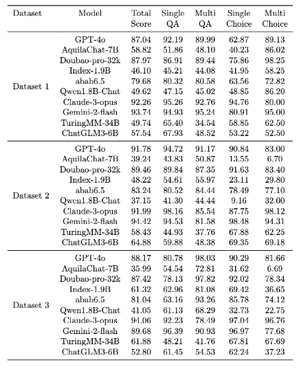 (2)实验模型与评分设置 实验模型选择:采用Monte Carlo sampling(蒙特卡罗抽样)和Bootstrap resampling(自助重抽样)进行系统的敏感性分析,并使用Kendallτcoefficient(肯德尔τ系数)来衡量排名一致性。从而确定了最优的 LLM 集合规模和选择标准。实验结果表明,我们的Q指标具有很强的泛化能力。在涵盖不同架构、规模的三个异构模型组中,均呈现出一致的模式。最终选择GPT-4o作为判分大模型。选择5个闭源大模型和5个开源大模型参与实验。 评分设置:单轮问答 / 选择题满分 5 分,多轮题每轮独立评分(满分 5 分);采用 GPT-4o 作为自动评分器(经人类标注验证,皮尔逊相关系数 0.8224),所有得分通过最小-最大缩放法归一化,消除不同题型评分尺度差异。