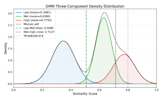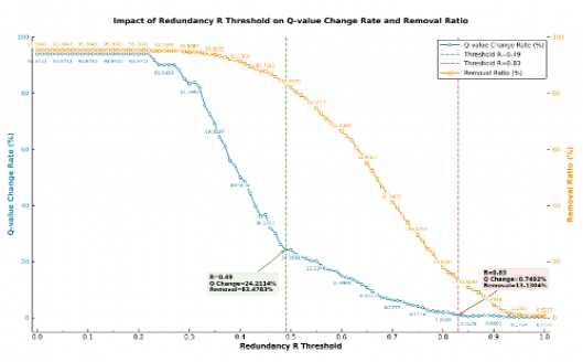 突破传统“全局相似性计算”缺陷,通过构建相似度矩阵,仅在最低维度内计算余弦相似度,通过子维度冗余率公式(1)计算局部冗余情况,并以加权冗余率公式(2) 聚合全局结果(图1)。最后,该研究结合GMM聚类(见图2)和离散阈值扫描实验(见图3)确定冗余阈值(0.5为潜在冗余、0.8为高冗余),最终以“子维度优先剔除、高维度校验平衡”的策略实现全局优化。
