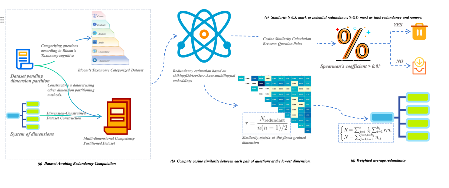 大型语言模型(LLMs)的快速发展加剧了对该研究针对当前大语言模型(LLMs)评测体系中数据集质量参差不齐、区分度不足以及冗余度过高等问题,提出了一种基于熵驱动的自动化数据集质量评估与优化方法。该方法从信息论视角出发,通过层级相似性矩阵精准识别语义重复项,结合加权熵质量指标量化题目有效性与差异性,实现了从全局视角对评测数据集的系统化优化。在保持任务覆盖度和语义完整性的前提下,显著降低了无效样本比例,提升了数据集的整体可判别性与模型评测稳定性。