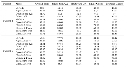 在数据集2和数据集3上进行了质量分析,并基于模型输出一致性和任务区分度指标,分别从中提取出高质量题目,构建了优化后的正式评估数据集4和数据集5(即数据集2 →数据集4,数据集3 →数据集5)。如表3 所示,大模型们在原始数据集上的得分整体偏高,区分效果不明显;在经过本方法筛选后的高质量数据集上(表4),模型评估结果区分性显著提升。这充分证明了我们提出的质量评估与优化方法的有效性。