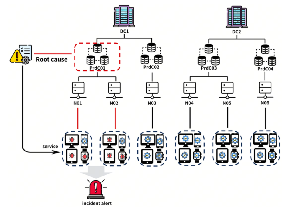 图 1:云系统中批量故障的示例。两个数据中心承载多个集群(如PrdC01–PrdC04),每个集群包含若干节点,为终端用户提供服务。当 某个集群(如PrdC01)发生故障时,异常会传播至其下属节点(Node01–Node02),从而引发大规模服务中断,并触发聚合告警。这一过程典型地展示了批量故障在云环境中的形成方式。