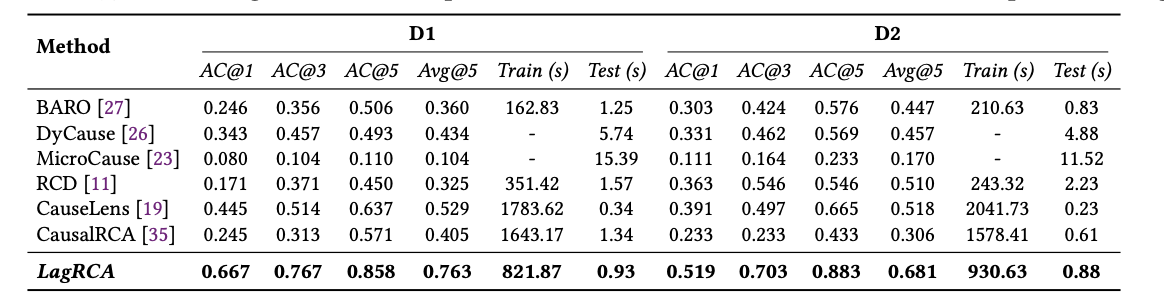 论文在两个具有代表性的数据集上对 LagRCA 进行了系统评估:其一是来源于真实生产环境的工业级微服务数据集 D1,包含 46 个微服务实例与 146 个故障案例;其二是基于 Online Boutique 构建的公开基准数据集 D2,包含 41 个微服务实例与 161 个故障案例。实验结果表明,LagRCA 在两个数据集上的根因定位准确率均显著优于 BARO、DyCause、CauseLens、RCD、MicroCause、CausalRCA 等代表性方法。