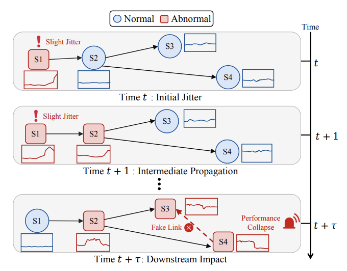微服务架构已成为现代互联网与云服务系统的核心支撑。然而,随着服务数量不断增长、依赖关系日益复杂,局部故障极易沿调用链逐步扩散,演化为大范围级联异常。高效开展根因定位是保障系统稳定运行和用户体验的关键。论文指出,在实际微服务系统中,上游故障往往不会立刻导致下游出现告警,而是会经过若干秒甚至数分钟后,才在依赖服务中逐步显现。这种具有异步性和多时滞特征的传播过程,给现有根因定位方法带来了很大挑战。